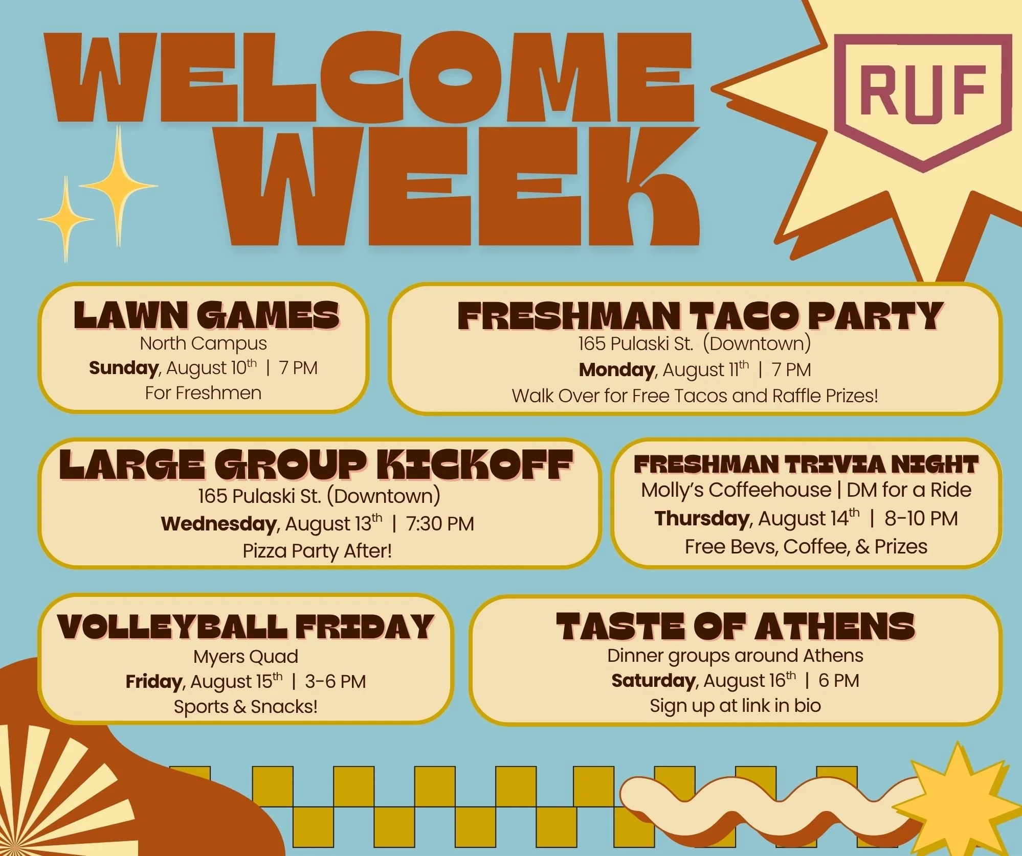 There’s free parking at/all around Redeemer’s building so use any spot you find. You can ignore the ParkMobile signs, parking during RUF events is free! When you arrive, you’ll be greeted by some friendly faces and a room full of people who’ll be eager to meet you. Worship kicks off at 7:30p and we’re all wrapped up by 8:45pm.